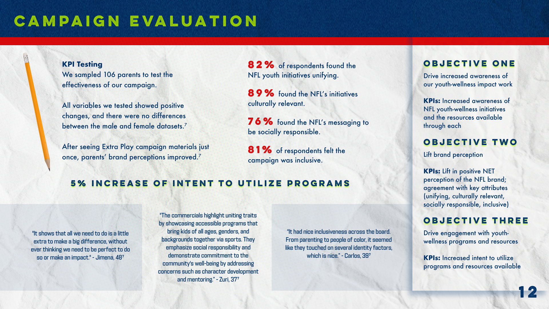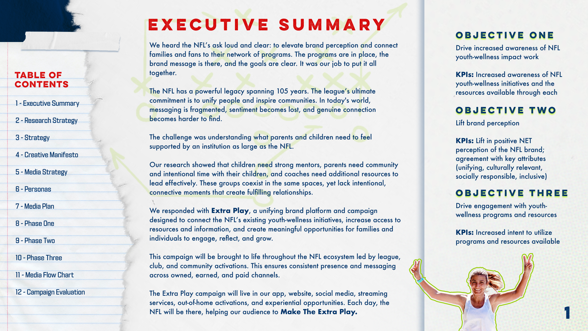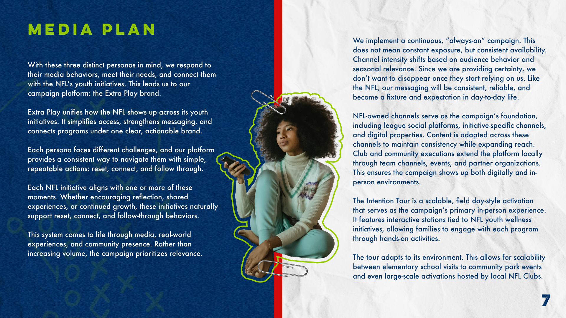 For this campaign, the 2026 NSAC competition asked to create a unifying brand for the NFL youth initiatives. I served as Creative Director, overseeing the copy, graphic design, and film teams to bring the campaign to life. I collaborated closely with the research, strategy, and media teams to ensure all elements were aligned and cohesive. After developing the plans book, we created and delivered a 20-minute presentation that fully brought the campaign to life. This year, we presented in Portland, Oregon, competing against six other schools as part of District 11.