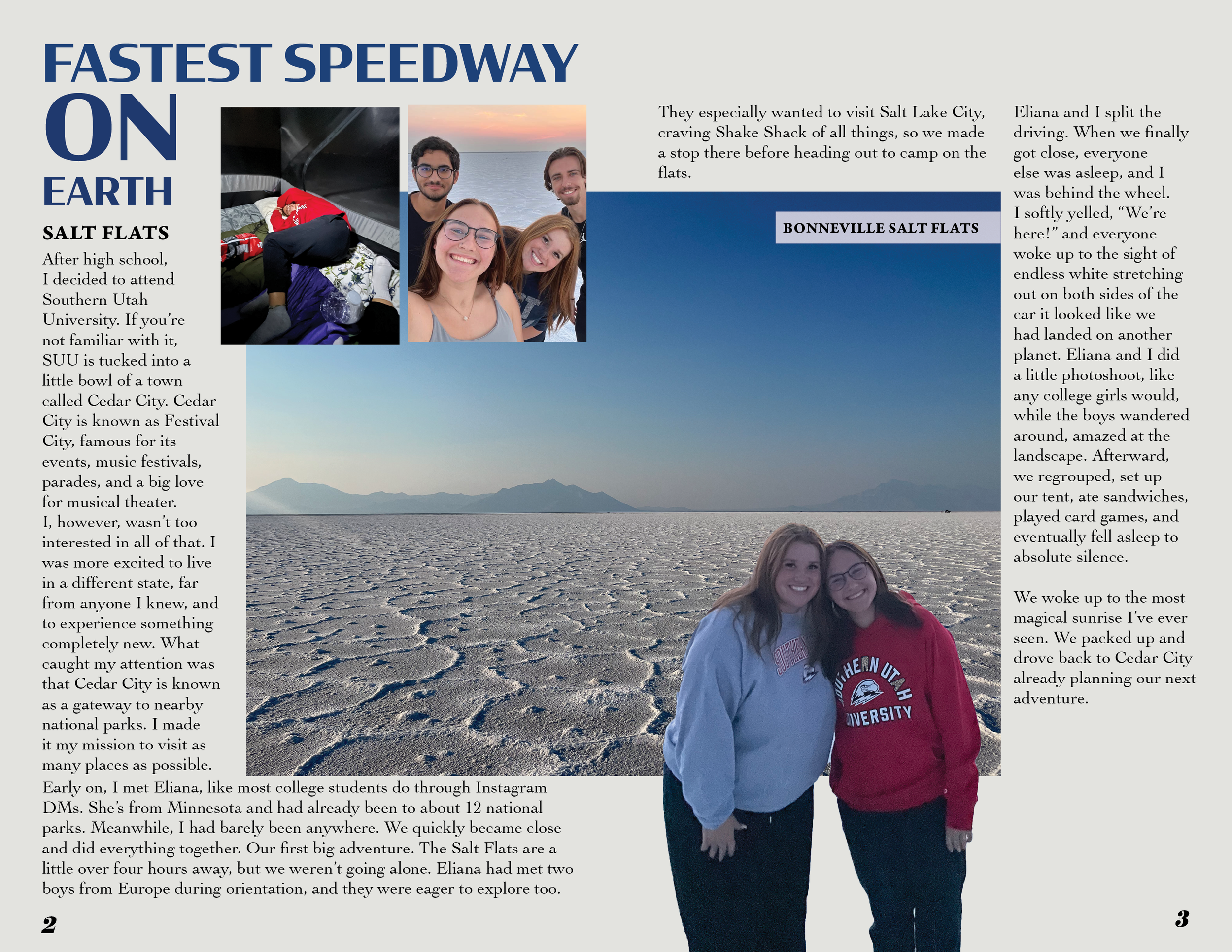 This project was not only a reflection of my journey and personal growth, but also a chance to practice visual storytelling, something I’m passionate about incorporating into all of my design work. Every page in the spread is a snapshot of movement, memory, and freedom—things I hope to keep chasing long after graduation.